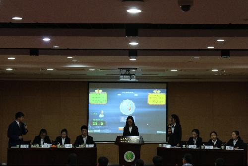 晚上七点半 ,表演赛正式开始。首先,主席向大家详细介绍了辩论赛比赛细则与到场评委嘉宾。随后,八位辩手依次入场就坐,比赛正式开始。